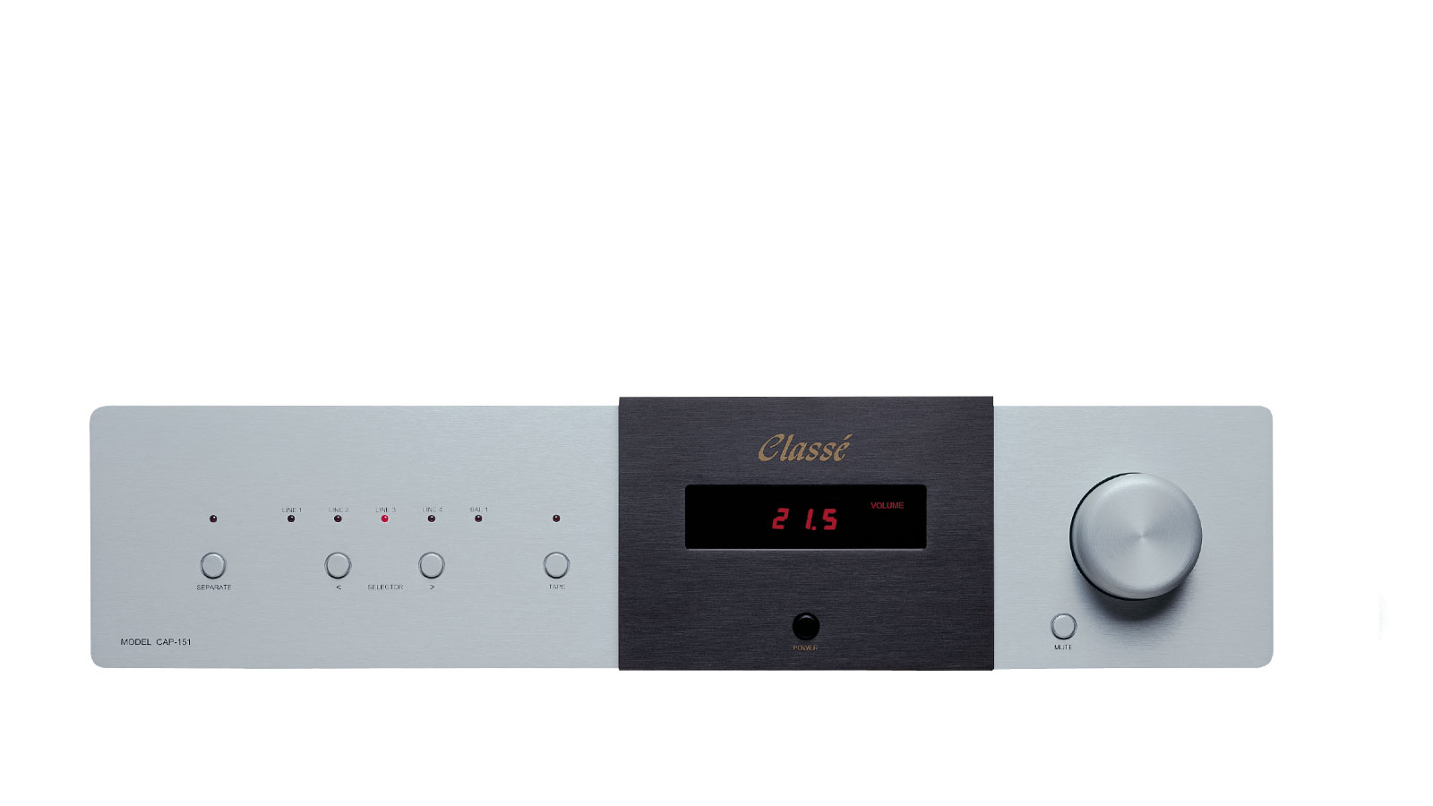 The CAP-151 has a contoured, slimline chassis. Inputs include: REG1 (or Phono), REG2, REG3, REG4, REG5 and BAL1. Outputs include TAPE, PREAMP and SPEAKER. Remote controls include: Power On/Off, Volume, Balance, Mute, Input Selection, Tape and Display . Front panel controls include: INPUT SELECTOR, VOLUME, TAPE, MUTE and POWER. The Special Classé front panel is in Soft Shadow Silver with an Anodized Black Fascia